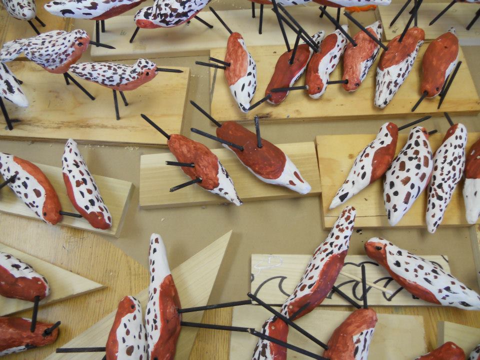 Inspired by Moonbird, these beautifully painted rufa red knots seek pearls of horseshoe crab eggs under the paper sand. This is education at its best.